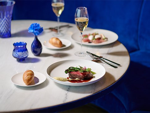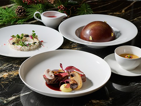 ソースが贅沢な一皿をより一層華やかに引き立てます。クラインブルーのベルベットと緑の植栽が鮮やかに彩る空間で、東京を見渡す絶景を眺めながら、冬の味覚を堪能する素敵な年始のひとときをお過ごしください。